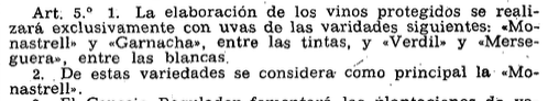 El Reglamento definía las variedades autorizadas para la elaboración de vinos protegidos, destacando la Monastrell como variedad principal. También se establecía la subzona vitícola denominada “Campo Arriba”, integrada exclusivamente por viñedos de esta variedad.