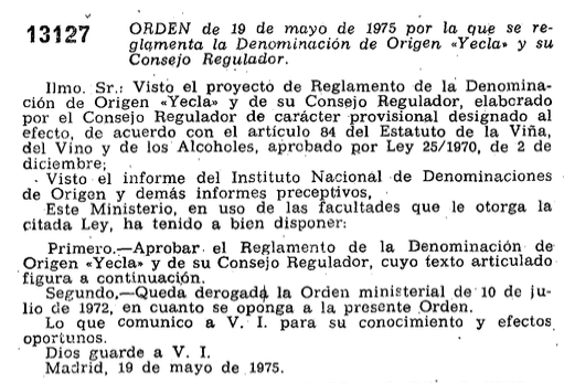 «Aprobar el Reglamento de la Denominación de Origen “Yecla” y de su Consejo Regulador, cuyo texto articulado figura a continuación.» (Orden de 19 de mayo de 1975. BOE núm. 146, página 13127)